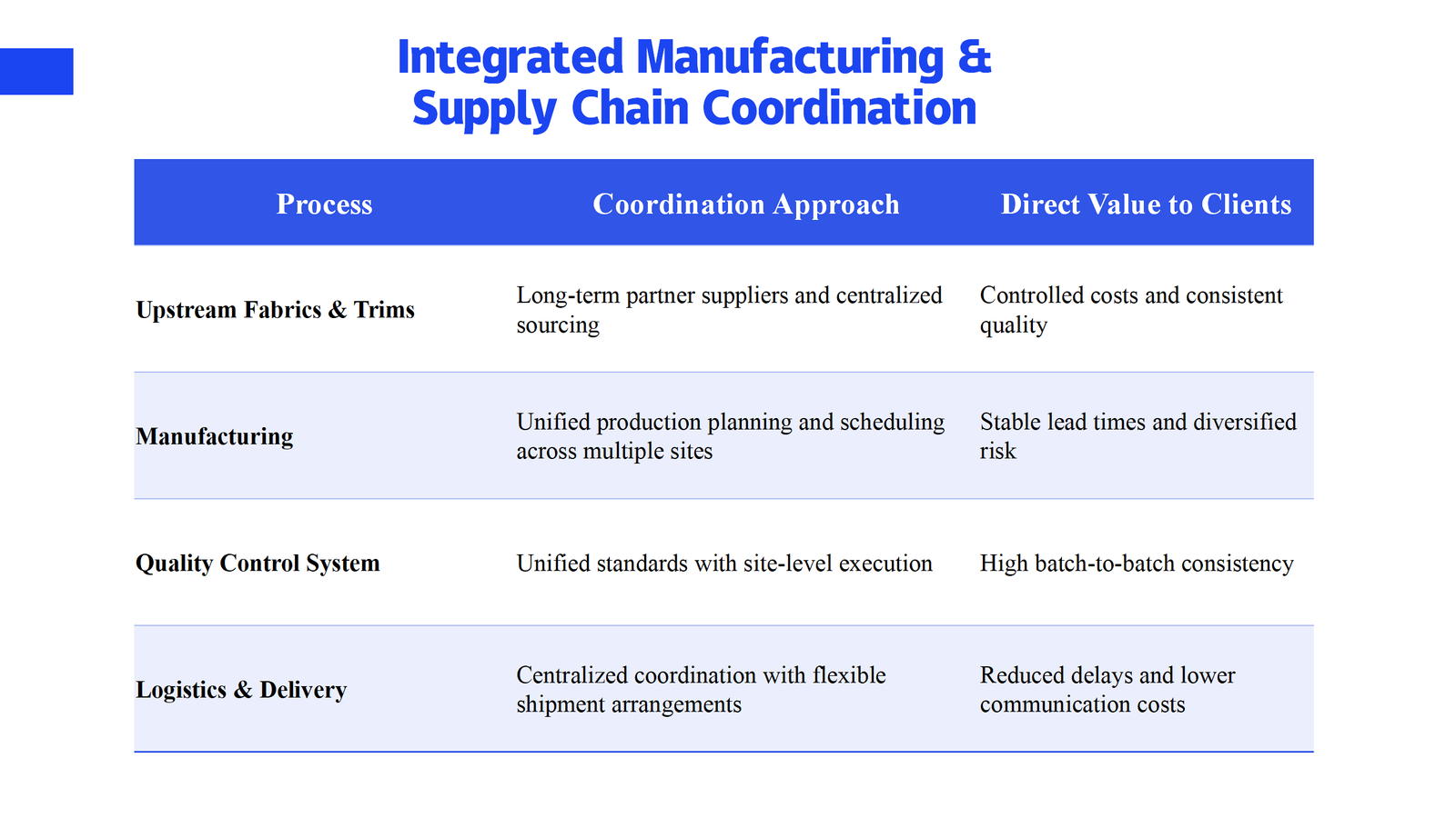 Through an integrated manufacturing and trading model, we coordinate manufacturing, supply chain operations, and international trade processes. Clear and traceable controls are applied across production planning, quality management, and delivery scheduling to ensure quality consistency and predictable lead times, supporting long-term client cooperation.