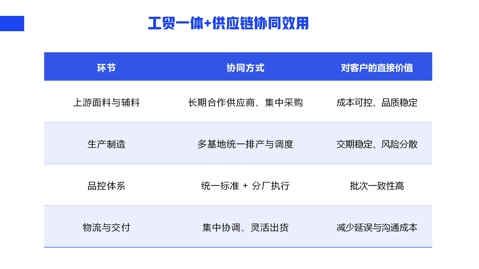 我们通过工贸一体化的运营模式,将服装制造、供应链协同与国际贸易流程进行统一管理与协调。